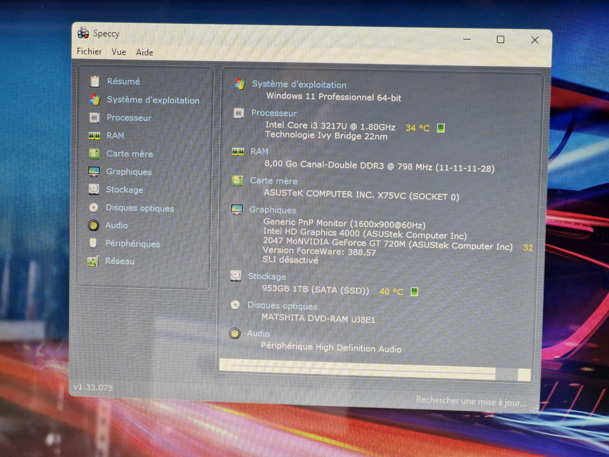 PC portable – ASUS X75VC – PC Portable 17.3″ – Intel Core i3-3217U / 8Go RAM / 1To HDD / GeForce 720M / Windows 11 Pro